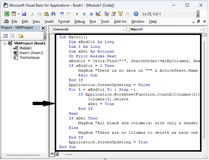 MsgBox "There are no Columns to delete as each one has more data (rows) than just a header.", vbExclamation, "Delete empty columns"
