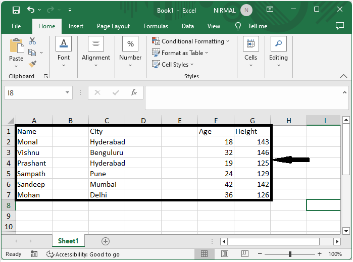 考慮一個Excel工作表,其中您的資料以表格形式顯示,並且包含一些空列,如下面的螢幕截圖所示。
