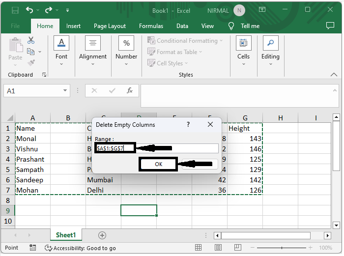 然後,單擊F5執行模組,選擇資料範圍,然後單擊“確定”以刪除多個空列。