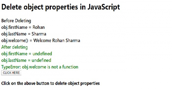 <!DOCTYPE html> <html lang="en" > <head> <meta charset="UTF-8" /> <meta name="viewport" content="width=device-width, initial-scale=1.0" /> <title>Document</title> <style> body { font-family: "Segoe UI", Tahoma, Geneva, Verdana, sans-serif; } .result,.sample { font-size: 20px; font-weight: 500; } </style> </head> <body> <h1>Delete object properties in JavaScript</h1> <div class="sample">Before Deleting <br /></div> <div style="color: green;" class="result">After deleting<br /></div> <button class="btn">CLICK HERE</button> <h3> Click on the above button to delete object properties </h3> <script> let btnEle = document.querySelector(".btn"); let resEle = document.querySelector(".result"); let sampleEle = document.querySelector(".sample"); let obj = { firstName: "Rohan", lastName: "Sharma", welcome() { return "Welcome " + this.firstName + " " + this.lastName; }, }; function beforeDelete() { sampleEle.innerHTML += "obj.firstName = " + obj.firstName + "<br>"; sampleEle.innerHTML += "obj.lastName = " + obj.lastName + "<br>"; sampleEle.innerHTML += "obj.welcome() = " + obj.welcome() + "<br>"; } beforeDelete(); btnEle.addEventListener("click", () => { delete obj.firstName; delete obj.lastName; delete obj.welcome; resEle.innerHTML += "obj.firstName = " + obj.firstName + "<br>"; resEle.innerHTML += "obj.lastName = " + obj.lastName + "<br>"; try { resEle.innerHTML += "obj.welcome() = " + obj.welcome() + "<br>"; } catch (err) { resEle.innerHTML += err; } }); </script> </body> </html>