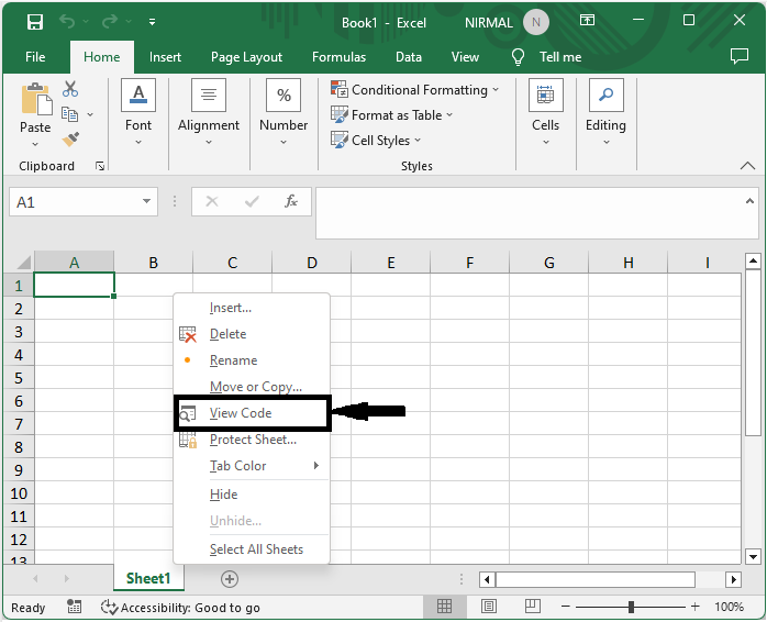 首先,右鍵單擊包含專案的工作表的表名,然後單擊“檢視程式碼”以開啟 VBA 應用程式。