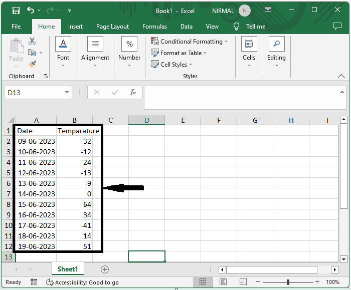 在這裡,我們將首先建立一個VBA模組並選擇單元格範圍來完成此任務。讓我們來看一個簡單的過程,學習如何在Excel中刪除包含負值的整行。