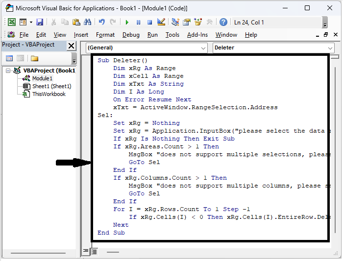 MsgBox "does not support multiple columns, please select again", vbInformation, "Delete Rows Negativel"
