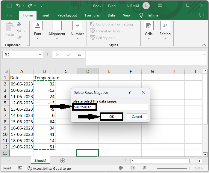 步驟3:然後單擊F5執行程式碼,選擇包含負值的單元格範圍,然後單擊“確定”。然後您會看到包含負值的整行將被刪除。