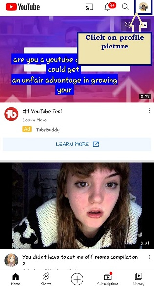 - 在您的裝置上開啟 YouTube 應用並登入您的帳戶。在螢幕右上角,點選您的個人資料圖片。