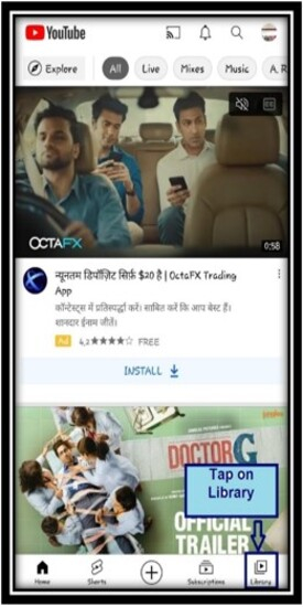 開啟 YouTube 應用程式 - 首先,轉到 YouTube 應用程式並在您的手機上開啟它。點選“庫”選項將其開啟。