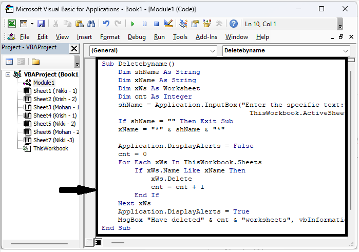 在這裡,我們將首先建立一個 VBA 模組並輸入特定文字以完成任務。因此,讓我們瞭解一個簡單的過程,瞭解如何刪除工作簿中名稱包含特定文字的工作表。