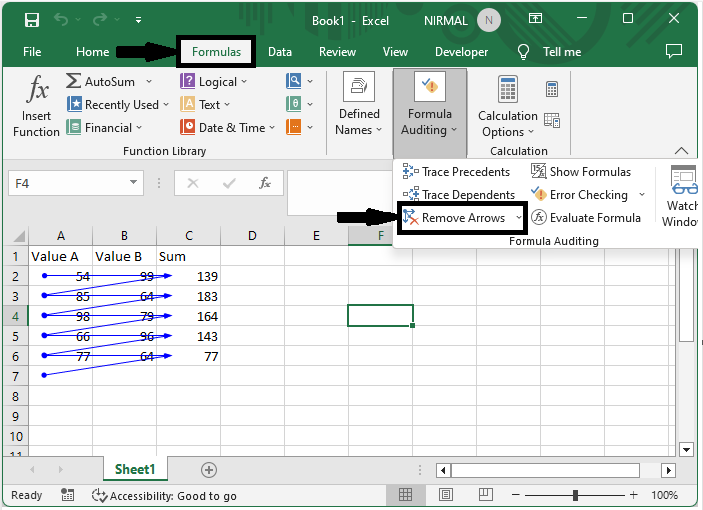 在這裡,我們將以最簡單的方式完成任務。讓我們來看一個簡單的流程,學習如何在Excel中刪除追蹤箭頭。