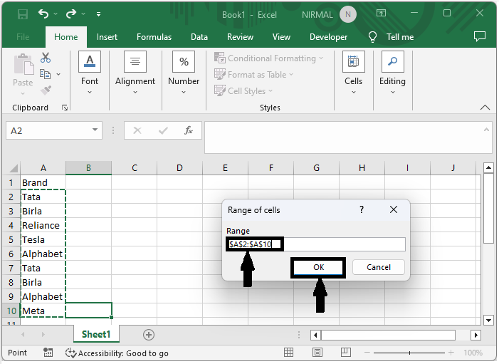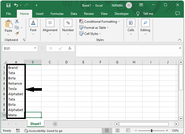 考慮一個Excel表格,其中包含帶有重複值和唯一值的姓名列表,類似於下面的圖片。