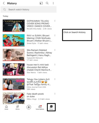 步驟 1 - 如果您在其他人的 YouTube 頻道上發表了評論,並且想要刪除該評論,請點選搜尋歷史記錄。您必須選擇主頁底部的“資料庫”選項以檢視您的歷史記錄。您可以從那裡訪問“歷史記錄”選項。