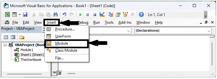 考慮任何包含多個工作表的 Excel 工作簿。首先,右鍵單擊工作表名稱並選擇“檢視程式碼”以開啟 VBA 應用程式。然後,單擊“插入”,選擇“模組”,並將下面提到的程式碼複製到文字框中。