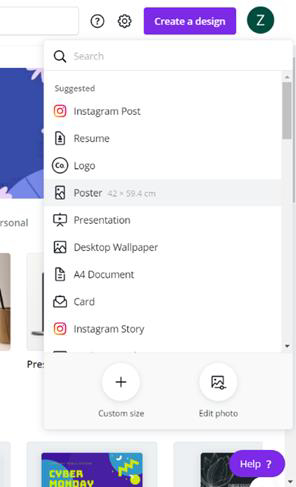 轉到您的帳戶儀表板,點選網頁最頂部右側的“建立設計”按鈕。您將看到一個包含各種選項的下拉選單。