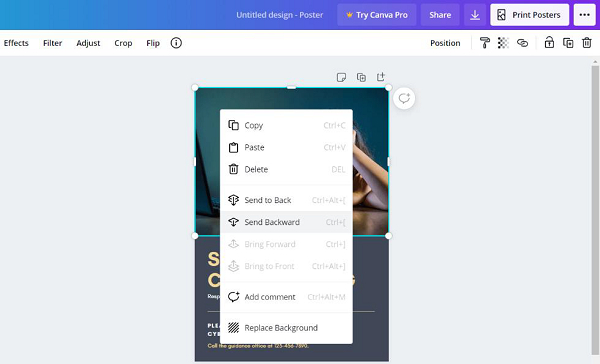 要將設計元素、字型或影像向前或向後移動,請選擇它並按左鍵以開啟選項列表。從此列表中選擇最合適的選項。