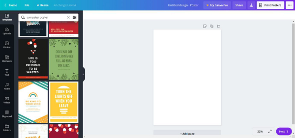 這就是設計選項卡的外觀。在此頁面中,您可以選擇一個模板並進行編輯,或者從頭開始建立海報。