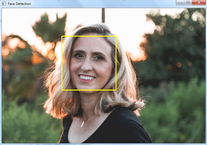 # import required library import cv2 # read the input image img = cv2.imread('people.jpg') # convert to grayscale of each frames gray = cv2.cvtColor(img, cv2.COLOR_BGR2GRAY) # read haacascade to detect faces in input image face_cascade = cv2.CascadeClassifier('haarcascades\haarcascade_frontalface_alt.xml') # detects faces in the input image faces = face_cascade.detectMultiScale(gray, 1.1, 2) print('Number of detected faces:', len(faces))\ # loop over all the detected faces for (x,y,w,h) in faces: # To draw a rectangle around the detected face cv2.rectangle(img,(x,y),(x+w,y+h),(0,255,255),2) # Display an image in a window cv2.imshow('Face Detection',img) cv2.waitKey(0) cv2.destroyAllWindows()