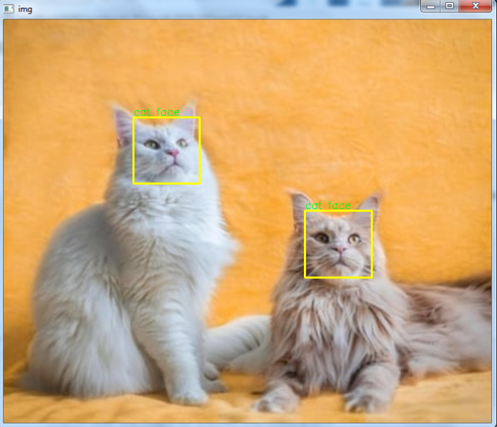 # import required libraries import cv2 # read the input image img = cv2.imread('two-cats.jpg') # convert the input image to grayscale gray = cv2.cvtColor(img, cv2.COLOR_BGR2GRAY) # read the haarcascade to detect cat faces cat_cascade = cv2.CascadeClassifier('haarcascades\haarcascade_frontalcatface.xml') # Detects cat faces in the input image faces = cat_cascade.detectMultiScale(gray, 1.1, 3) print('Number of detected cat faces:', len(faces)) # if atleast one cat face id detected if len(faces) > 0: for (x,y,w,h) in faces: print("Cat face detected") # To draw a rectangle in a face cv2.rectangle(img,(x,y),(x+w,y+h),(0,255,255),2) cv2.putText(img, 'cat face', (x, y-3), cv2.FONT_HERSHEY_SIMPLEX, 0.5, (0,255,0), 1) else: print("No cat face detected") # Display an image in a window cv2.imshow('Cat Image',img) cv2.waitKey(0) cv2.destroyAllWindows()