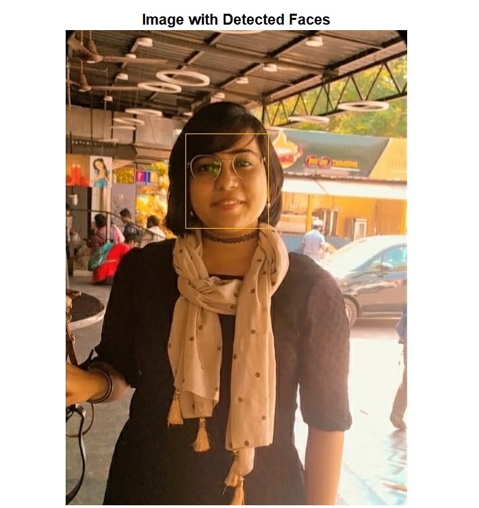之後,我們使用此面部檢測器物件來檢測輸入影像中的人臉。接下來,我們透過在人臉周圍放置矩形來突出顯示檢測到的人臉。最後,我們使用“imshow”函式顯示輸出影像。
