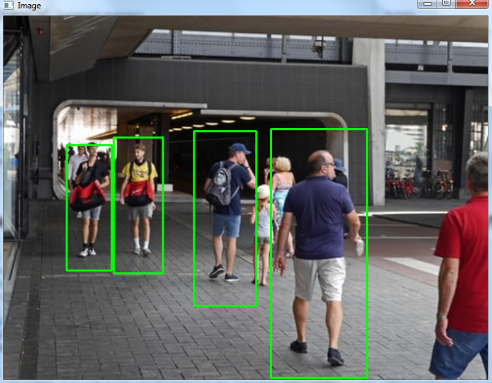 # import required libraries import cv2 # Reading the Image image = cv2.imread('people1.jpg') # initialize the HOG descriptor hog = cv2.HOGDescriptor() hog.setSVMDetector(cv2.HOGDescriptor_getDefaultPeopleDetector()) # detect humans in input image (humans, _) = hog.detectMultiScale(image, winStride=(10, 10), padding=(32, 32), scale=1.1) # getting no. of human detected print('Human Detected : ', len(humans)) # loop over all detected humans for (x, y, w, h) in humans: pad_w, pad_h = int(0.15 * w), int(0.01 * h) cv2.rectangle(image, (x + pad_w, y + pad_h), (x + w - pad_w, y + h - pad_h), (0, 255, 0), 2) # display the output image cv2.imshow("Image", image) cv2.waitKey(0) cv2.destroyAllWindows()
