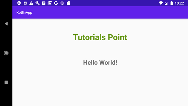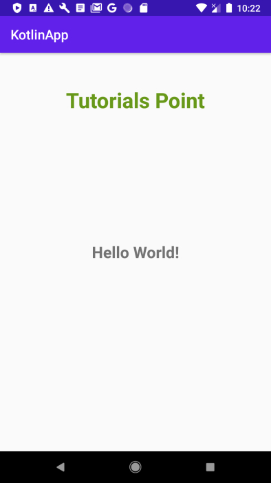 <?xml version="1.0" encoding="utf-8"?> <RelativeLayout xmlns:android="http://schemas.android.com/apk/res/android" xmlns:app="http://schemas.android.com/apk/res-auto" xmlns:tools="http://schemas.android.com/tools" android:layout_width="match_parent" android:layout_height="match_parent" tools:context=".MainActivity"> <TextView android:layout_width="wrap_content" android:layout_height="wrap_content" android:layout_centerHorizontal="true" android:layout_marginTop="50dp" android:text="Tutorials Point" android:textAlignment="center" android:textColor="@android:color/holo_green_dark" android:textSize="32sp" android:textStyle="bold" /> <TextView android:layout_centerInParent="true" android:layout_width="wrap_content" android:layout_height="wrap_content" android:text="Hello World!" android:textSize="24sp" android:textStyle="bold" /> </RelativeLayout>