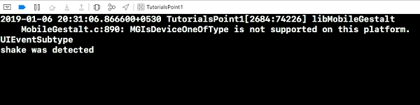 }還在 viewDidLoad() 方法中新增 “self.becomeFirstResponder()”。當我們在模擬器上執行 obve 程式碼並使用除錯來生成震動手勢時,下面就是生成的結果。我們可以根據自己的使用情況修改上面的程式碼,並且在我們應用程式中執行不同的操作。