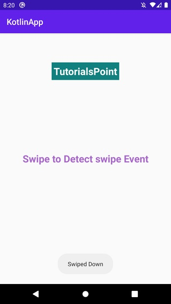 <?xml version="1.0" encoding="utf-8"?> <RelativeLayout xmlns:android="http://schemas.android.com/apk/res/android" android:id="@+id/relativeLayout" android:layout_width="match_parent" android:layout_height="match_parent"> <TextView android:id="@+id/textView" android:layout_width="wrap_content" android:layout_height="wrap_content" android:layout_centerHorizontal="true" android:layout_marginTop="70dp" android:background="#008080" android:padding="5dp" android:text="TutorialsPoint" android:textColor="#fff" android:textSize="24sp" android:textStyle="bold" /> <TextView android:layout_width="match_parent" android:layout_height="wrap_content" android:layout_centerInParent="true" android:text="Swipe to Detect swipe Event" android:textAlignment="center" android:textColor="@android:color/holo_purple" android:textSize="24sp" android:textStyle="bold" /> </RelativeLayout>