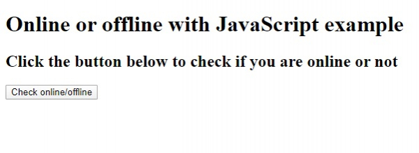 <!DOCTYPE html> <html> <body> <h1>Online or offline with JavaScript example</h1> <h2>Click the button below to check if you are online or not</h2> <button onclick="checkOnlineOffline()">Check online/offline</button> <h2 class="sample"></p> <script> function checkOnlineOffline() { if(navigator.onLine===true){ document.querySelector('.sample').innerHTML = "You are connected to internet" } else { document.querySelector('.sample').innerHTML = "You are not connected to internet" } } </script> </body> </html>