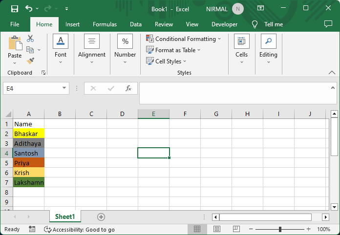 考慮任何包含不同背景顏色的單元格列表的Excel工作表,類似於下圖。