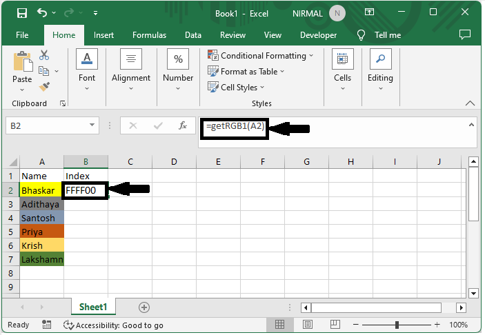 現在在Excel中,單擊一個空單元格(在本例中為單元格B2),輸入公式`=getRGB1(A2)`,然後單擊回車鍵以獲取第一個值。