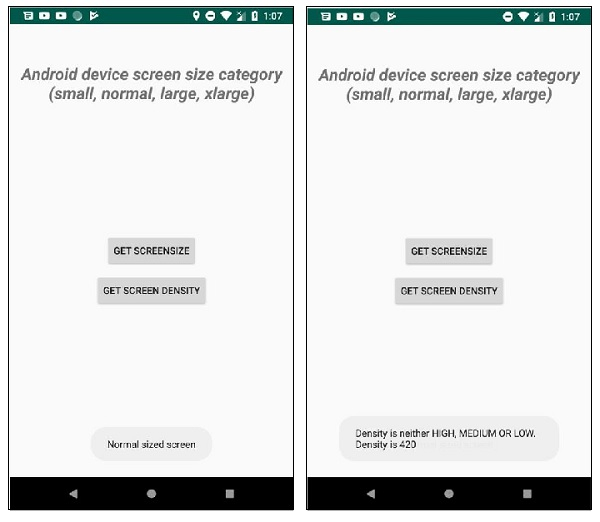 <?xml version="1.0" encoding="utf-8"?> <RelativeLayout xmlns:android="http://schemas.android.com/apk/res/android" xmlns:tools="http://schemas.android.com/tools" android:layout_width="match_parent" android:layout_height="match_parent" android:padding="16dp" tools:context=".MainActivity"> <Button android:id="@+id/btnGetScreenSize" android:layout_width="wrap_content" android:layout_height="wrap_content" android:layout_centerInParent="true" android:onClick="GetScreenSize" android:text="Get ScreenSize" /> <Button android:layout_width="wrap_content" android:layout_height="wrap_content" android:layout_below="@id/btnGetScreenSize" android:layout_centerInParent="true" android:layout_marginTop="10dp" android:onClick="GetScreenDensity" android:text="Get Screen Density" /> <TextView android:layout_width="match_parent" android:layout_height="wrap_content" android:layout_marginTop="40dp" android:text="Android device screen size category (small, normal, large, xlarge)" android:textAlignment="center" android:textSize="24sp" android:textStyle="bold|italic" /> </RelativeLayout>