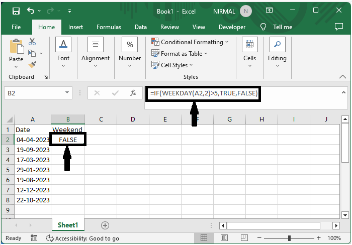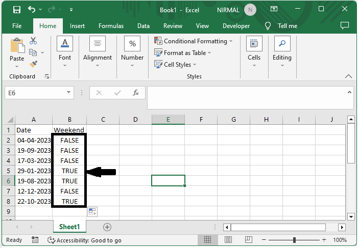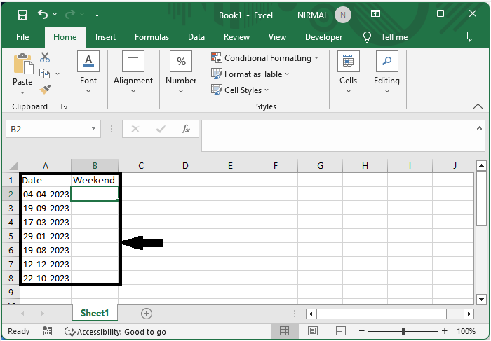 我們將使用公式獲得其中一個結果,然後使用自動填充柄完成任務。讓我們來看一個簡單的過程,瞭解如何在Excel中確定或檢查日期是否為週末。