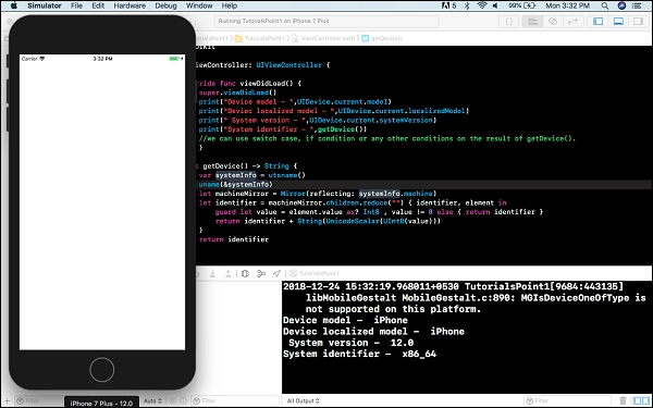以下是在 iOS 12.0 版本的模擬器上執行 iPhone 7 Plus 時程式碼執行情況的示例