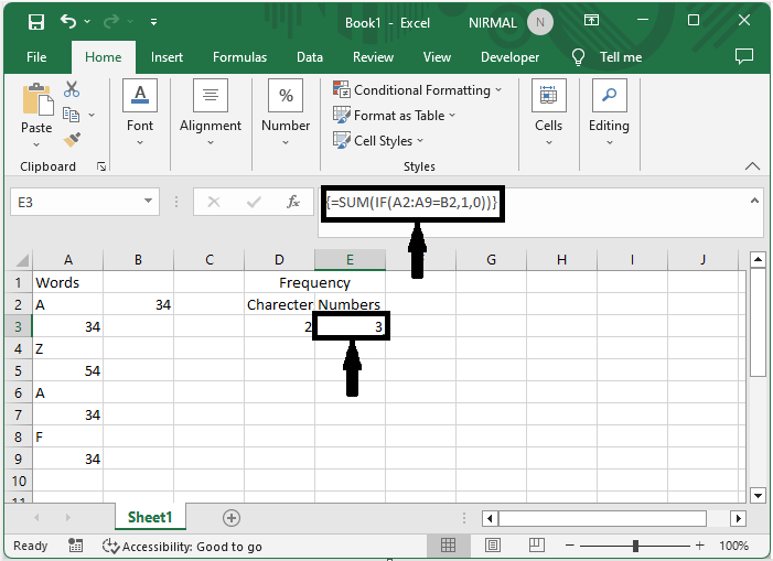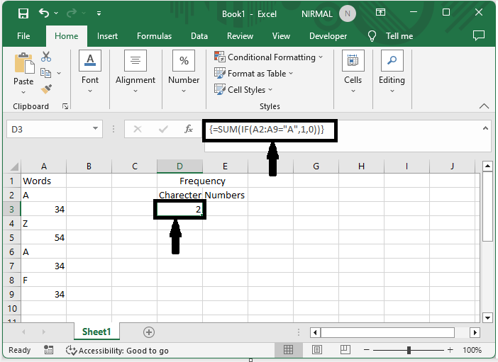 首先,要計算字元的頻率,單擊一個空單元格並輸入公式 `=SUM(IF(A2:A(="A",1,0))`,然後單擊CTRL + SHIFT + ENTER。