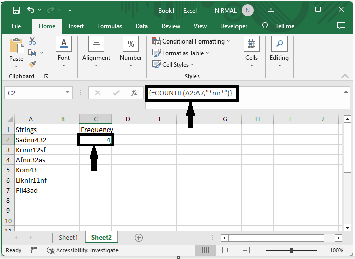 然後,要計算字串的頻率,單擊一個空單元格並輸入公式 `=COUNTIF(A2:A7,"*nir*")`,然後單擊CTRL + SHIFT + ENTER。