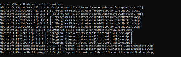 列印已安裝的 .NET Core 執行時列表。SDK 的 x86 版本僅列出 x86 執行時,SDK 的 x64 版本僅列出 x64 執行時。