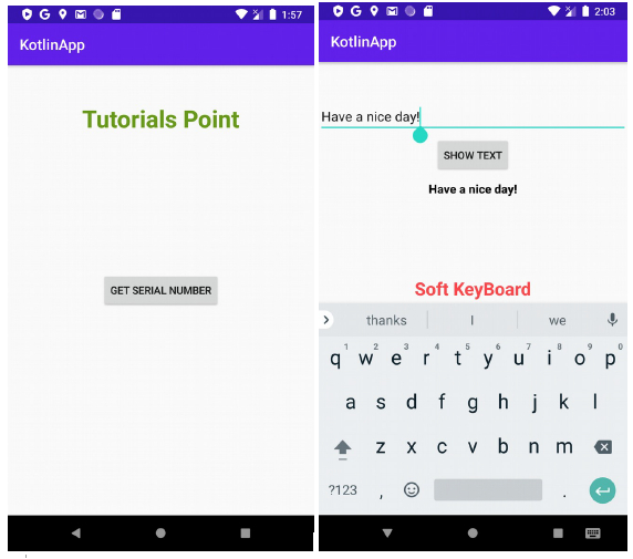 <RelativeLayout xmlns:android="http://schemas.android.com/apk/res/android" xmlns:tools="http://schemas.android.com/tools" android:layout_width="match_parent" android:layout_height="match_parent" tools:context=".MainActivity"> <EditText android:id="@+id/editText" android:layout_width="match_parent" android:layout_height="wrap_content" android:layout_centerHorizontal="true" android:layout_marginTop="50dp" /> <Button android:id="@+id/btnShow" android:layout_height="wrap_content" android:layout_below="@id/editText" android:layout_centerInParent="true" android:layout_marginTop="5dp" android:onClick="showText" android:text="SHOW TEXT" /> <TextView android:id="@+id/textView" android:layout_width="wrap_content" android:layout_height="wrap_content" android:layout_below="@id/btnShow" android:layout_centerInParent="true" android:layout_marginTop="10dp" android:textColor="@android:color/background_dark" android:textSize="16sp" android:textStyle="bold" /> <TextView android:layout_width="wrap_content" android:layout_height="wrap_content" android:layout_centerInParent="true" android:text="Soft KeyBoard" android:textColor="@android:color/holo_red_light" android:textSize="24sp" android:textStyle="bold" /> </RelativeLayout>
