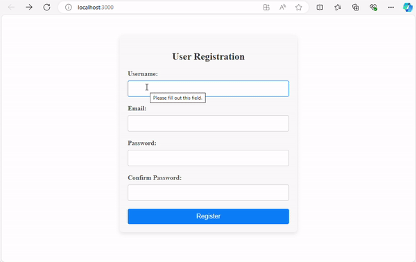 import React, { useState } from 'react'; // Import the CSS file import './index.css'; function App() { const [formData, setFormData] = useState({ username: '', email: '', password: '', confirmPassword: '', }); const [errorMessage, setErrorMessage] = useState(''); const [successMessage, setSuccessMessage] = useState(''); const handleChange = (e) => { const { name, value } = e.target; setFormData({ ...formData, [name]: value, }); }; const handleSubmit = (e) => { e.preventDefault(); if (formData.password !== formData.confirmPassword) { setErrorMessage('Passwords do not match!'); setSuccessMessage(''); } else { setErrorMessage(''); setSuccessMessage('Registration Successful!'); } }; return ( <div className="form-container"> <h2>User Registration</h2> <form className="registration-form" onSubmit={handleSubmit}> <div className="form-group"> <label htmlFor="username">Username:</label> <input type="text" id="username" name="username" value={formData.username} onChange={handleChange} required /> </div> <div className="form-group"> <label htmlFor="email">Email:</label> <input type="email" id="email" name="email" value={formData.email} onChange={handleChange} required /> </div> <div className="form-group"> <label htmlFor="password">Password:</label> <input type="password" id="password" name="password" value={formData.password} onChange={handleChange} required /> </div> <div className="form-group"> <label htmlFor="confirmPassword">Confirm Password:</label> <input type="password" id="confirmPassword" name="confirmPassword" value={formData.confirmPassword} onChange={handleChange} required /> </div> {errorMessage && <p className="error-message">{errorMessage}</p>} {successMessage && <p className="success-message">{successMessage}</p>} <button type="submit" className="submit-button">Register</button> </form> </div> ); } export default App;