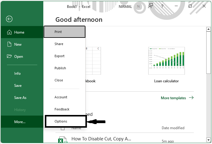 考慮任何 Excel 檔案。首先,單擊“檔案”,然後單擊“選項”以開啟 Excel 選項。