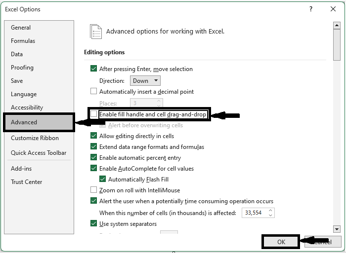 然後單擊“高階”,取消選中名為“啟用檔案處理和單元格拖放”的框,然後單擊“確定”以完成任務。