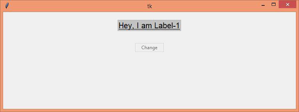 #Import necessary Library from tkinter import * from tkinter import ttk from tkinter.filedialog import asksaveasfile #Create an instance of tkinter window win= Tk() #Set the geometry of tkinter window win.geometry("750x250") #Define the function to change the value in label widget def change_text(label): label.configure(text= "Hey, I am Label-2", background="gray91") #Create a Label label = Label(win, text= "Hey, I am Label-1", font= ('Helvetica 15 underline'), background="gray76") label.pack(pady=20) #Create a button btn= ttk.Button(win,text= "Change", command= lambda:change_text(label), state= DISABLED) btn.pack(pady=10) win.mainloop()