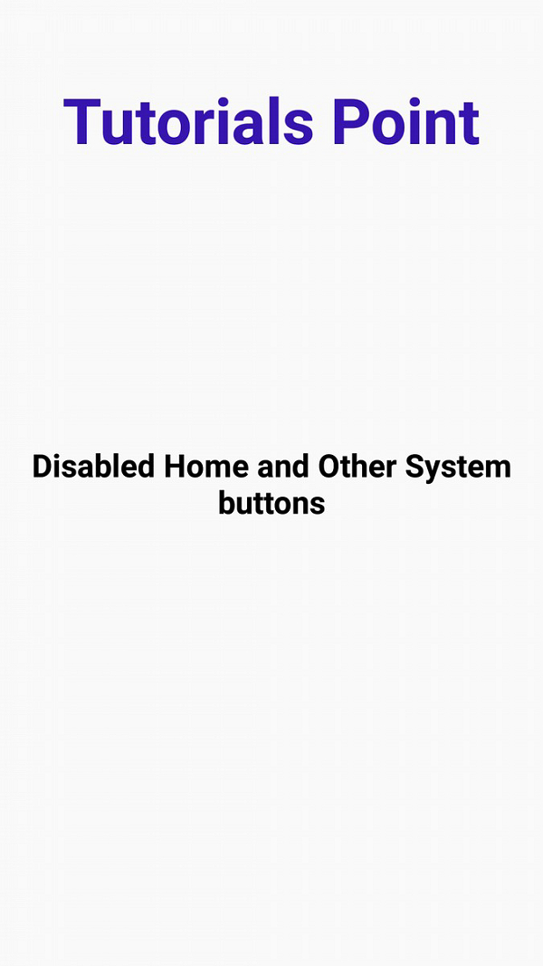 <?xml version="1.0" encoding="utf-8"?> <RelativeLayout xmlns:android="http://schemas.android.com/apk/res/android" xmlns:tools="http://schemas.android.com/tools" android:layout_width="match_parent" android:layout_height="match_parent" tools:context=".MainActivity"> <TextView android:id="@+id/textView" android:layout_width="wrap_content" android:layout_height="wrap_content" android:layout_centerHorizontal="true" android:layout_marginTop="50dp" android:padding="8dp" android:text="Tutorials Point" android:textColor="@color/colorPrimaryDark" android:textSize="48sp" android:textStyle="bold" /> <TextView android:layout_width="match_parent" android:layout_height="wrap_content" android:layout_centerInParent="true" android:text="Disabled Home and Other System buttons" android:textAlignment="center" android:textColor="@android:color/background_dark" android:textSize="24sp" android:textStyle="bold" /> </RelativeLayout>