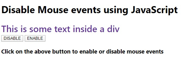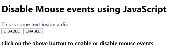 <!DOCTYPE html> <html lang="en"> <head> <meta charset="UTF-8" /> <meta name="viewport" content="width=device-width, initial-scale=1.0" /> <title>Document</title> <style> body { font-family: "Segoe UI", Tahoma, Geneva, Verdana, sans-serif; } .result { font-size: 18px; font-weight: 500; color: rebeccapurple; } .size { font-size: 30px; } </style> </head> <body> <h1>Disable Mouse events using JavaScript</h1> <div class="result">This is some text inside a div</div> <button class="Btn">DISABLE</button> <button class="Btn">ENABLE</button> <h3> Click on the above button to enable or disable mouse events </h3> <script> let resEle = document.querySelector(".result"); let sampleEle = document.querySelector(".sample"); let BtnEle = document.querySelectorAll(".Btn"); resEle.addEventListener("click", () => { resEle.classList.toggle("size"); }); BtnEle[0].addEventListener("click", () => { resEle.style.pointerEvents = "none"; }); BtnEle[1].addEventListener("click", () => { resEle.style.pointerEvents = "auto"; }); </script> </body> </html>