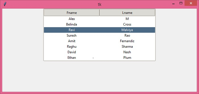 Treeview 小部件用於以列的形式顯示包含多個特徵的專案列表。預設情況下,Treeview 小部件中的列出專案可以多次選擇,但是,您可以在 Treeview 小部件建構函式中使用 selectmode="browse" 來停用此功能。可以使用 Treeview(root, column, **options) 建構函式實現 Treeview 小部件。