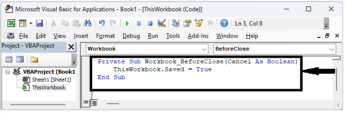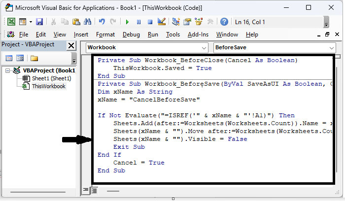 現在,再次在 VBA 應用程式中,對於“ThisWorkbook”視窗,將以下程式碼新增到現有程式碼中。