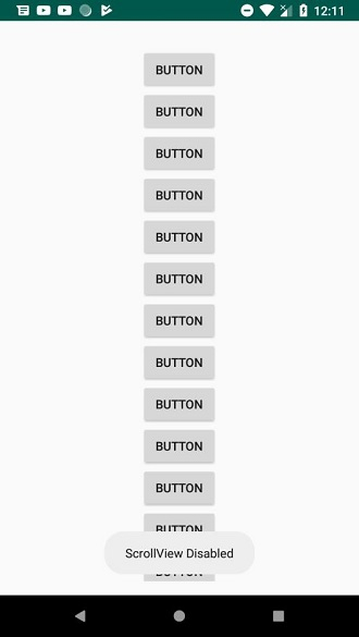 import androidx.annotation.RequiresApi; import androidx.appcompat.app.AppCompatActivity; import android.os.Build; import android.os.Bundle; import android.view.MotionEvent; import android.view.View; import android.widget.ScrollView; import android.widget.Toast; public class MainActivity extends AppCompatActivity { @RequiresApi(api = Build.VERSION_CODES.M) @Override protected void onCreate(Bundle savedInstanceState) { super.onCreate(savedInstanceState); setContentView(R.layout.activity_main); ScrollView scrollView = findViewById(R.id.scrollView); scrollView.setOnTouchListener(new View.OnTouchListener() { @Override public boolean onTouch(View v, MotionEvent event) { Toast.makeText(MainActivity.this, "ScrollView Disabled", Toast.LENGTH_SHORT).show(); return true; } }); } }