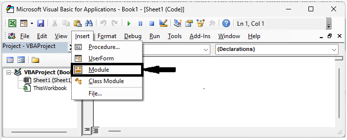 考慮任何包含資料透視表的 Excel 工作表。首先,右鍵單擊工作表名稱並單擊“檢視程式碼”以開啟 VBA 應用程式,然後單擊“插入”並選擇“模組”。