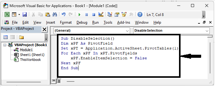 Sub DisableSelection() Dim xPF As PivotField Set xPT = Application.ActiveSheet.PivotTables(1) For Each xPF In xPT.PivotFields xPF.EnableItemSelection = True Next xPF End Sub