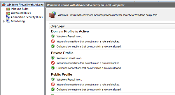 防火牆支援 3 種類型的配置檔案。a) 域 b) 公用 c) 私有配置檔案。您可以在**Windows 防火牆高階安全**設定視窗中使用 GUI 檢查相同的設定,如下所示。