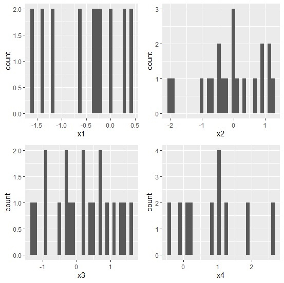 > p1 <- ggplot(df, aes(x1)) + geom_histogram() > p2 <- ggplot(df, aes(x2)) + geom_histogram() > p3 <- ggplot(df, aes(x3)) + geom_histogram() > p4 <- ggplot(df, aes(x4)) + geom_histogram() > PlotsList<- list(p1,p2,p3,p4)