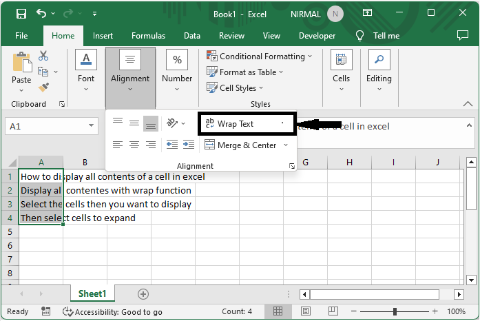 首先,選擇單元格範圍,然後單擊“開始”下的“自動換行”以完成任務。
