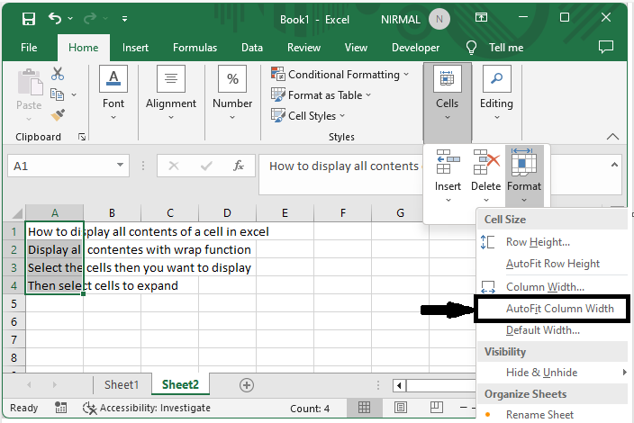 首先,選擇單元格範圍,然後單擊“開始”下的“格式”,並選擇“自動調整列寬”以完成任務。